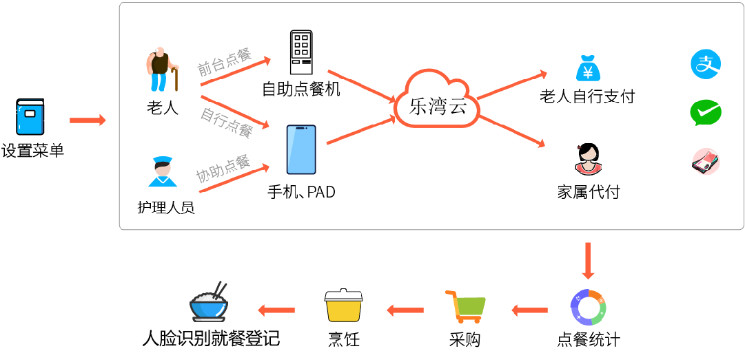 老人自主或由护工协助点餐后,系统产生菜品统计表和点餐表,食堂可按照统计表进行采购,烹饪后,按照点餐表为老人送餐、分餐。老人也可到食堂通过人脸识别进行就餐登记,避免错领、冒领。自动生成就餐报表。
